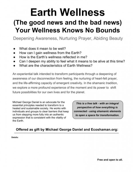The workshop consists of a bit of a talk involving holism and the relationship between our individual wellness and the Earth’s wellness. A good deal of the workshop is a drum meditation meant to emphasize a return to feeling as a path of alignment to greater wellness. The experience is organized around a framework of deepening awareness, nurturing prayer and abiding beauty.